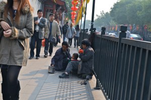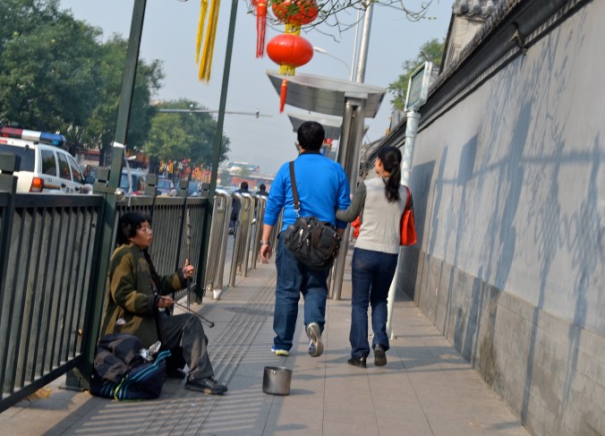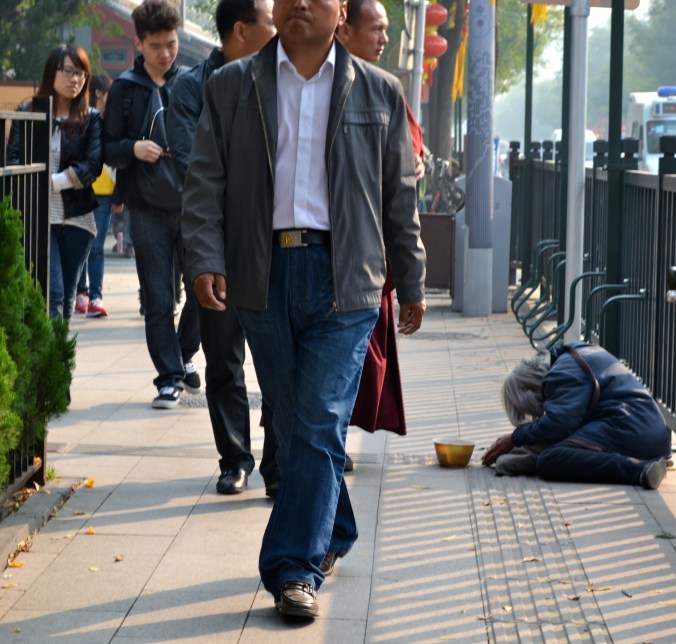 The homeless people in Beijing don’t reek of booze. They just look weary, like the old woman I saw outside the Lama Temple.