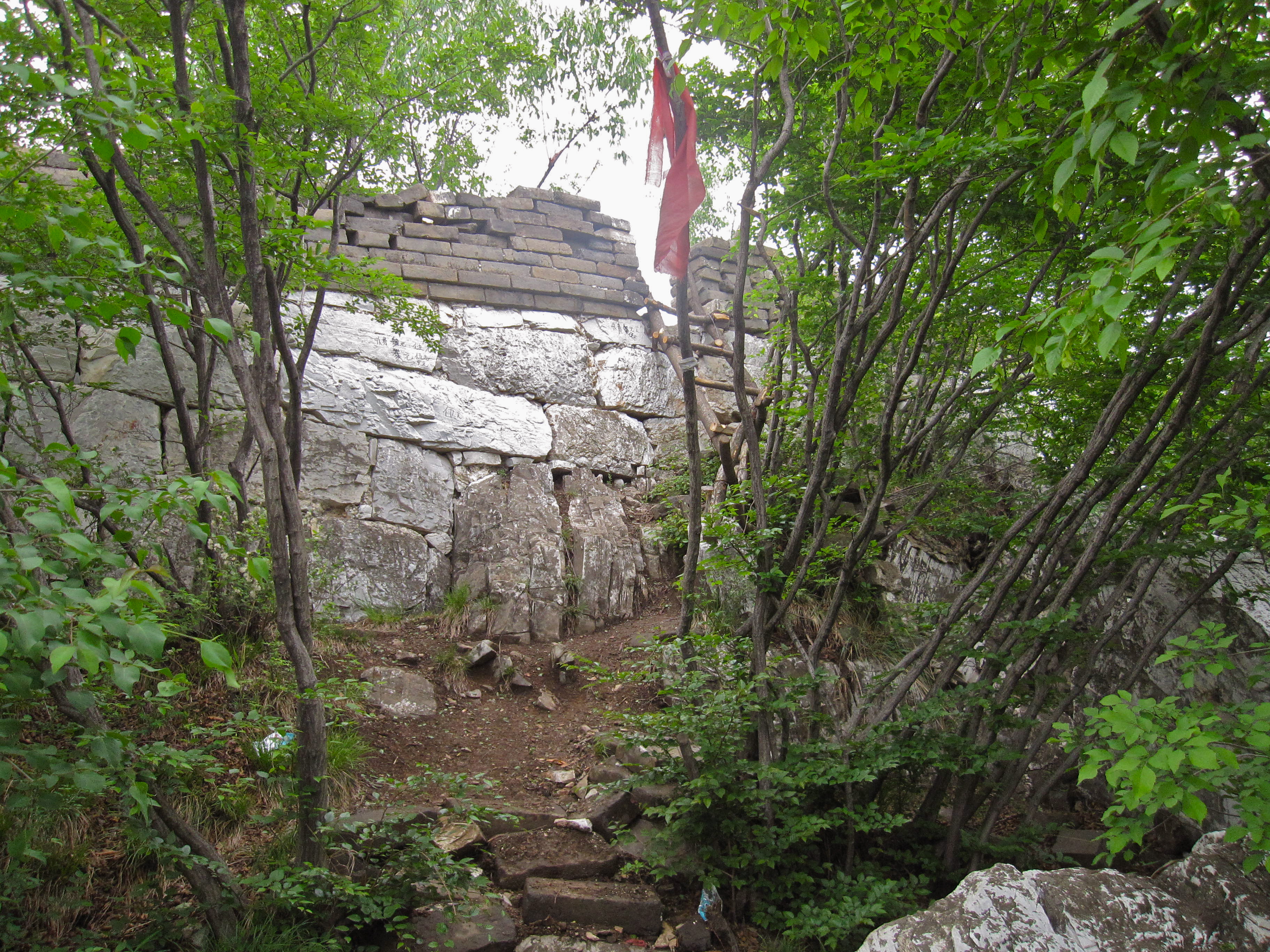 The trail to the top of the mountain was marked by pieces of red tape that had been tied to tree limbs, and after a couple of hours of following them, we made it to the wall.