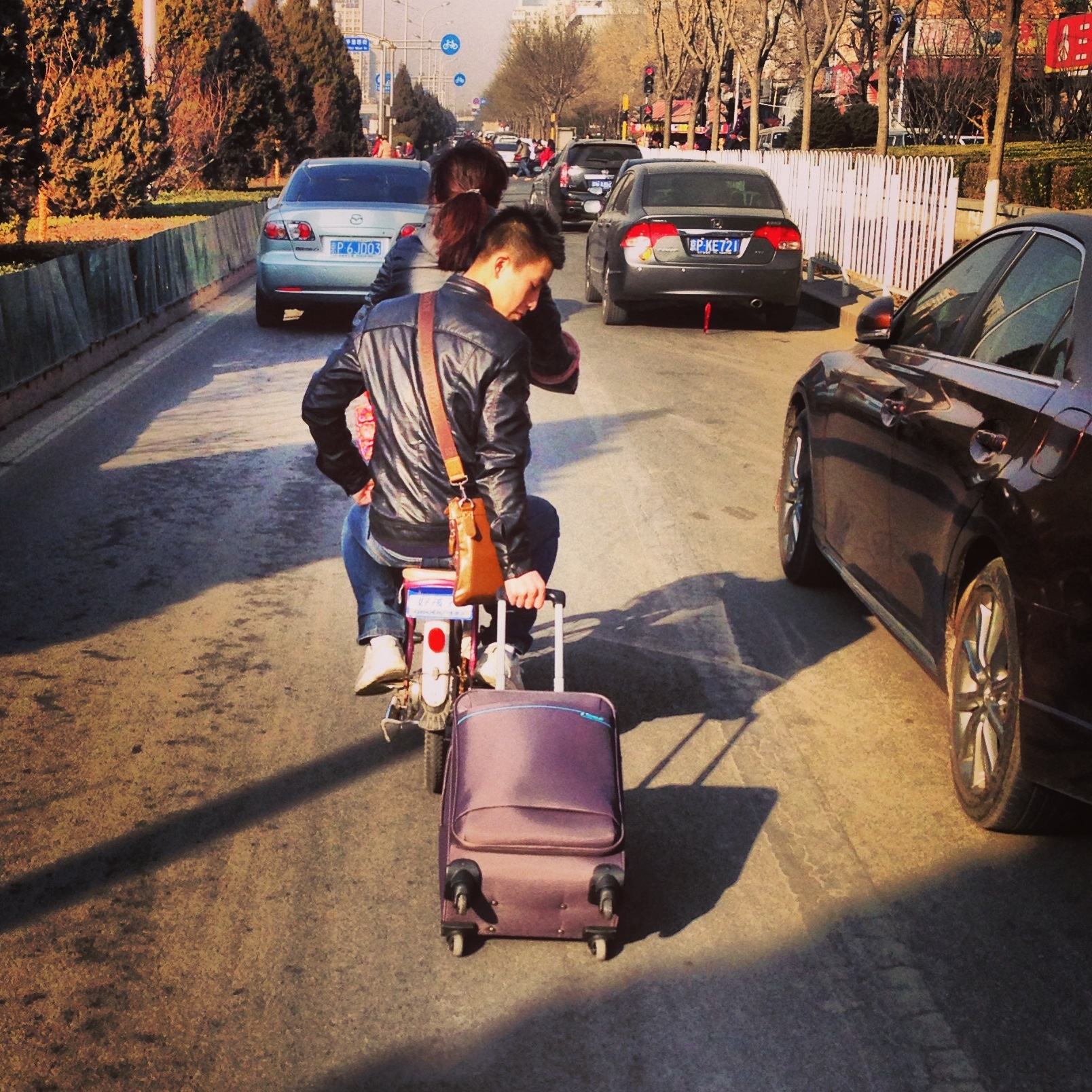 A man drags his luggage behind an electric bike in Beijing. The capital empties out in the week leading up to the Spring Festival holiday, with millions returning to their hometowns.
